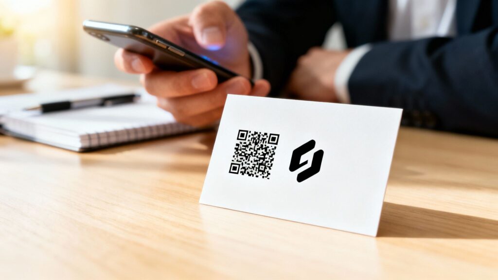 Adding a QR code to your business card is more than just a tech-forward move; it transforms a simple piece of cardstock into an interactive networking tool. This small square bridges the gap between your physical card and your digital presence, letting you share a wealth of up-to-date information with a quick scan. It’s how you make a first impression that’s both memorable and genuinely useful.